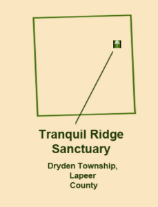 The TLC purchased the 0.45-acre Tranquil Ridge Sanctuary located along Lake George Road near the Oakland County border in Dryden Township, Lapeer County. The Sanctuary is located on top of a narrow ridge along the east edge of a huge forested valley, nearly 1 mile across and 2 miles long, with a series of lakes and wetlands at the bottom. This impressive ice-contact landscape formed as retreating glaciers left massive ice fragments across the interlobate region. These large ice blocks, surrounded by outwash deposits. melted away, leaving steep embankments around a depressions full of meltwater known as a kettle lakes.